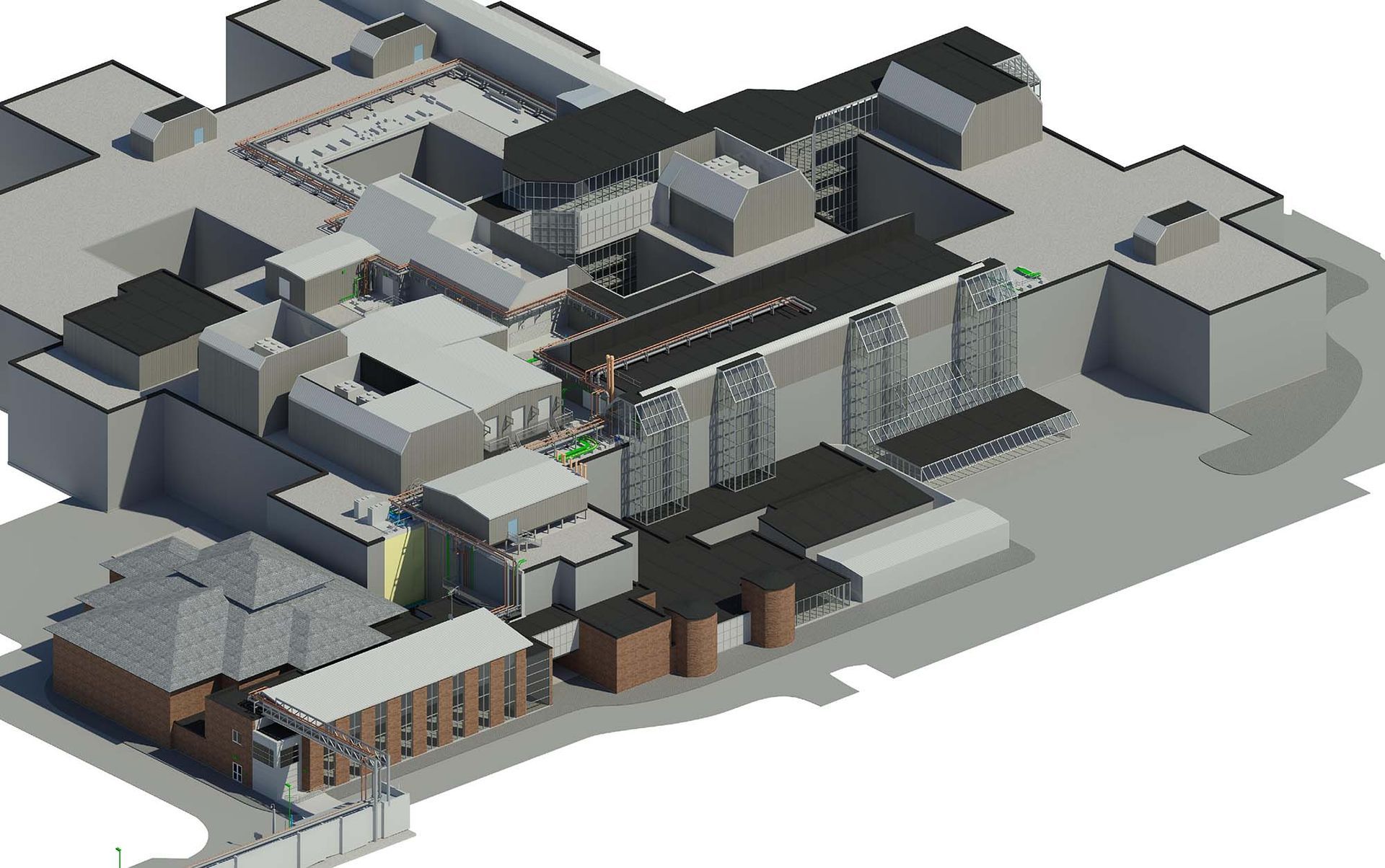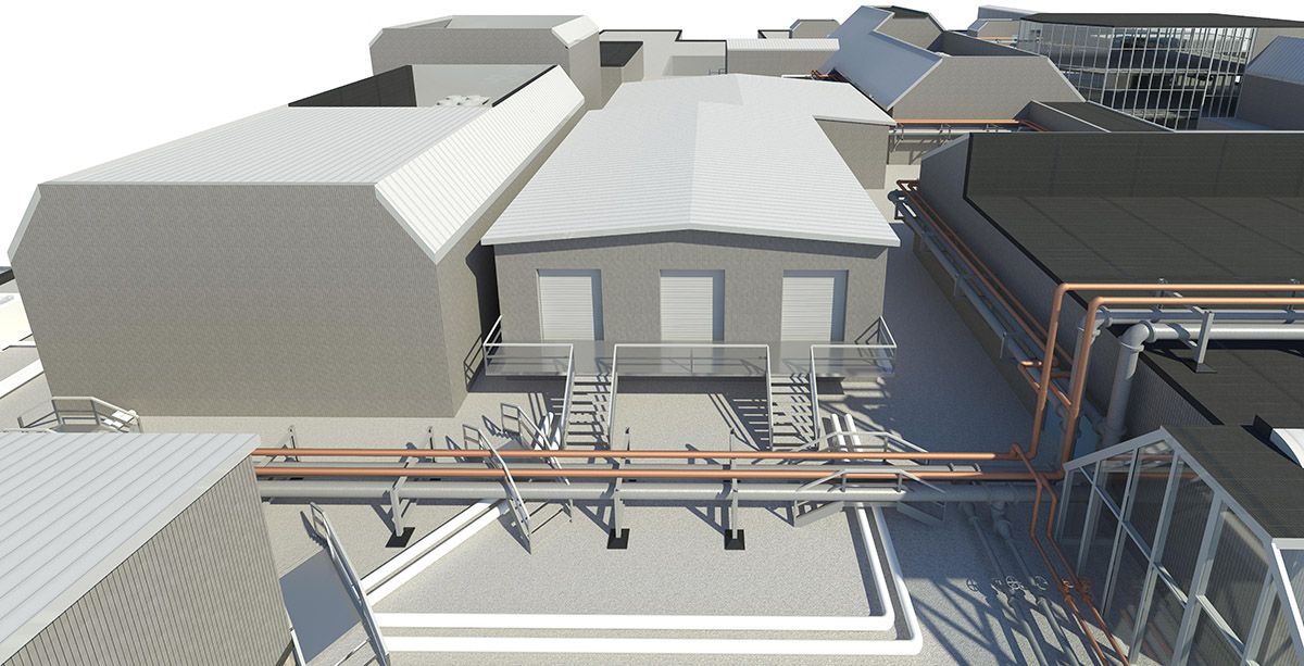 MRI Hospital Manchester. Proposed route for steam & condensate pipework to feed both existing & new plant-rooms. This is our provisional roof layout produced from footprint drawings & aerial photographs. As this building has been added on to many times over the years, the CAD model is a work in progress & will be updated as survey data is compiled.